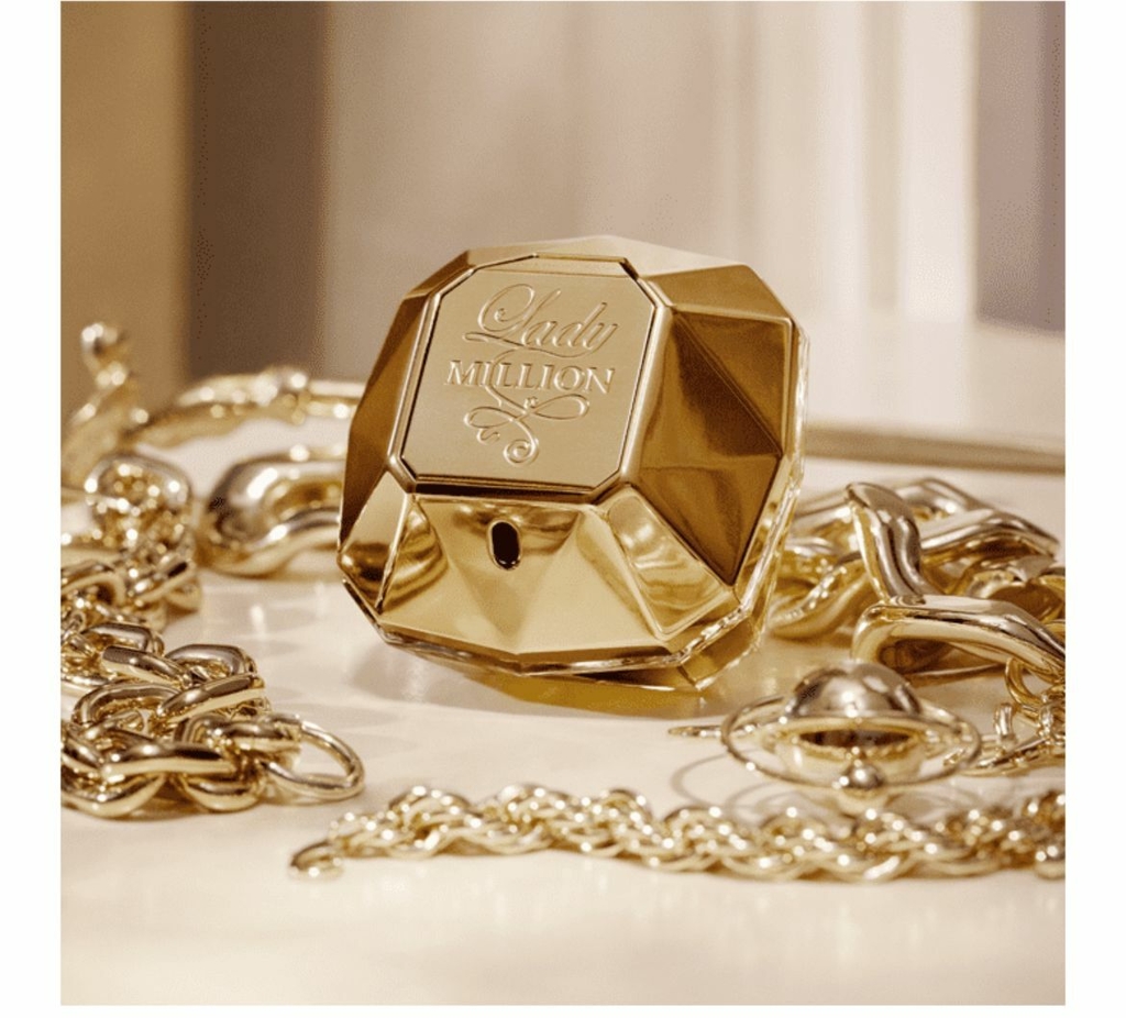 O Perfume Feminino Lady Million, de Paco Rabanne, é a expressão da riqueza e sofisticação, é um perfume sexy e profundamente elaborado, criado para a mulher poderosa, que tem o mundo aos seus pés. Para o Perfume Lady Million, Paco Rabanne selecionou um buquê de Flores Brancas sofisticadas e muito femininas, com Frutas e um fundo Doce bem marcante, com um toque de Mel. O frasco não podia ser mais adequado, inspirado no diamante Regente - famosa pedra, em exposição no museu do Louvre, em Paris - multifacetado, dourado, revelando todo o luxo do ouro e das joias.